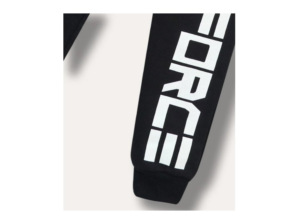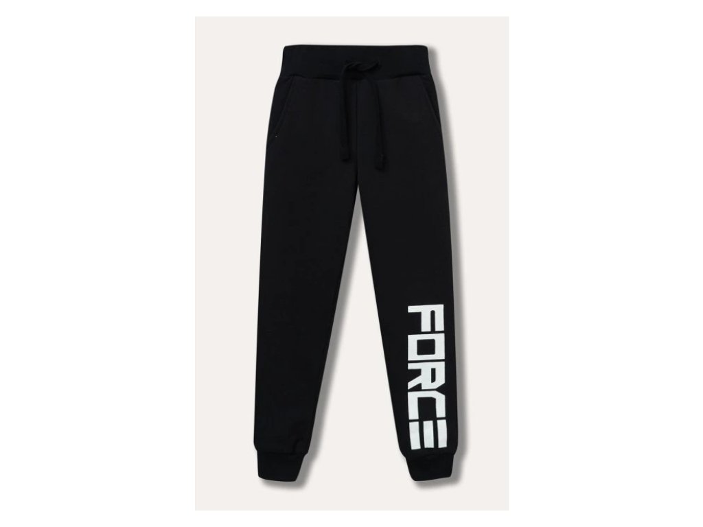Chlapecké bavlněné tepláky v černé barvě s bílým nápisem FORCE na jedné nohavici. Ideální do podzimních měsíců. Zahřeje a potěší díky jednoduchému designu a kvalitnímu materiálu - 100% bavlna. V pase do pružného nápletu s bavlněnou šňůrkou na případné stažení. Dvě postranní kapsy. Nohavice zakončeny do praktického patentu.