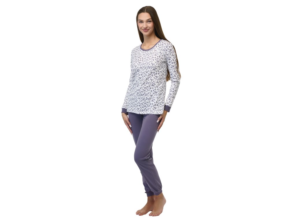 Příjemné dámské pyžamo s dlouhým rukávem a dlouhými nohavicemi. Úžasné bavlněné pyžamo, s dobře poddajnou gumou v pase. Kalhoty v barvě fialové, triko v barvě smetanové s drobným fialovým potiskem.
