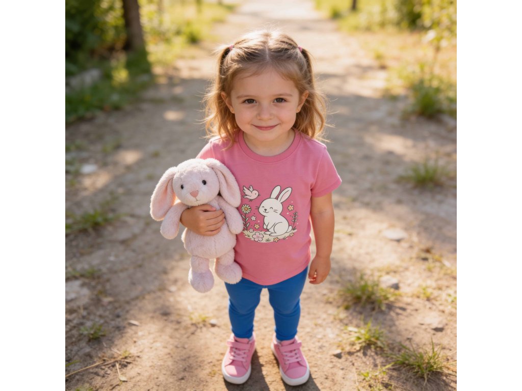 Představujeme dívčí bavlněné tričko, které kombinuje styl a pohodlí. Vyrobeno z kvalitní bavlny s 5% příměsí elastanu, zajišťuje maximální komfort a volnost pohybu. Krátké rukávy a kulatý výstřih dodávají klasický vzhled, zatímco roztomilý potisk zajíčka na přední straně přináší hravost a radost do každého dne. Ideální volba pro malé slečny, které chtějí vypadat skvěle a cítit se ještě lépe! Nechte své dítě zářit v tomto úžasném kousku!