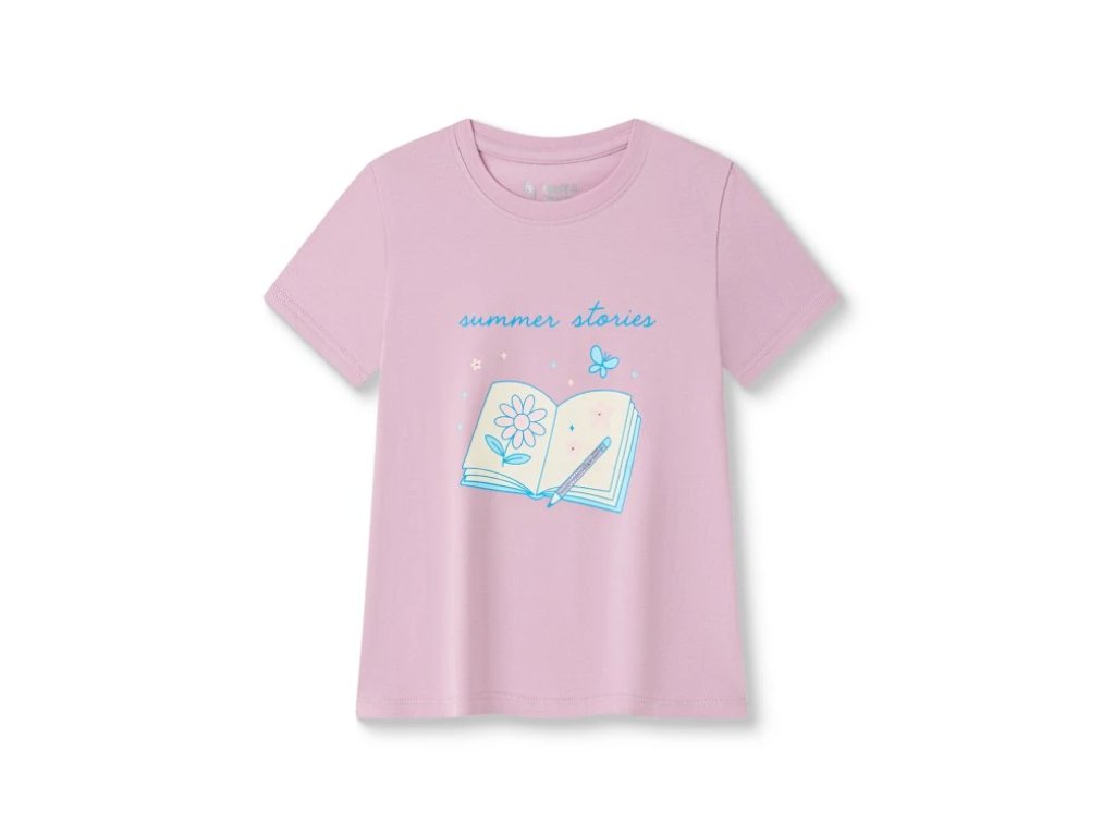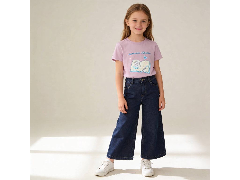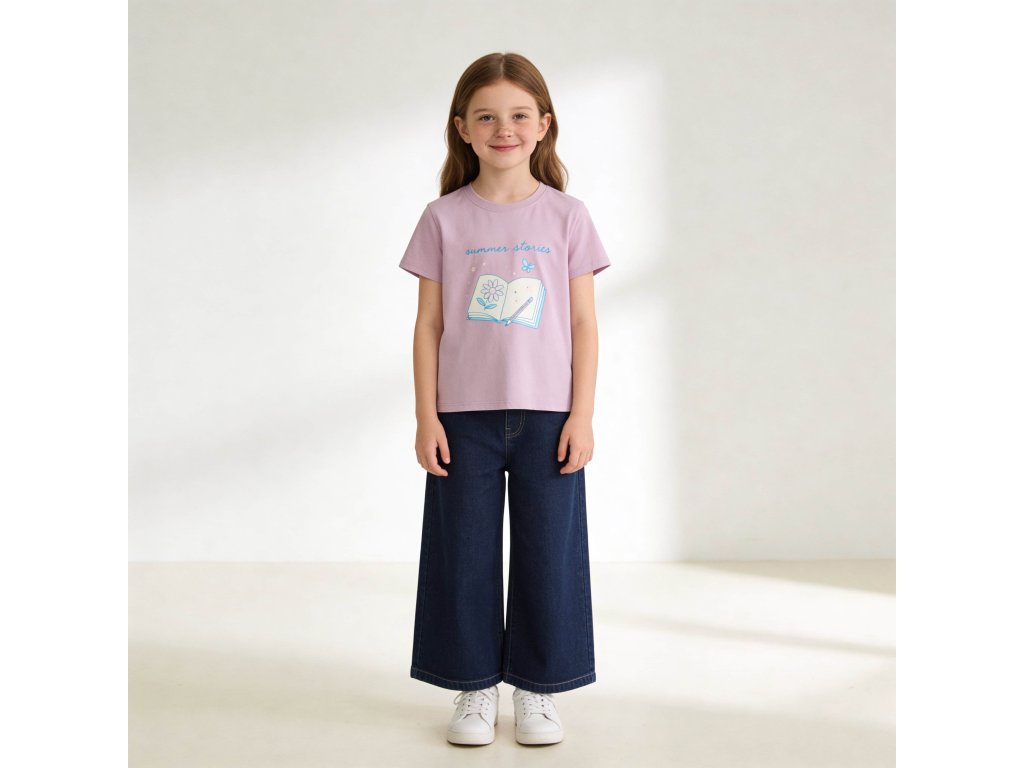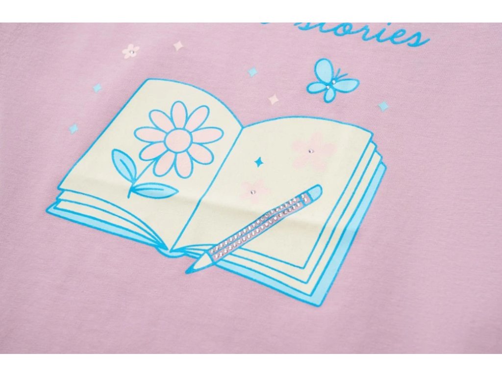 Dívčí bavlněné tričko s 5% podílem elastanu je ideální volbou pro pohodlné a stylové nošení. Krátké rukávy a kulatý výstřih u krku zajišťují volnost pohybu a komfort po celý den. Tričko je ozdobeno atraktivním potiskem a jemnou aplikací třpytivých kamínků na přední straně, což dodává modelu šmrnc. Jemná fialková barva podtrhuje dívčí eleganci a je snadno kombinovatelná s dalšími kousky šatníku. Perfektní pro každodenní nošení i speciální příležitosti.