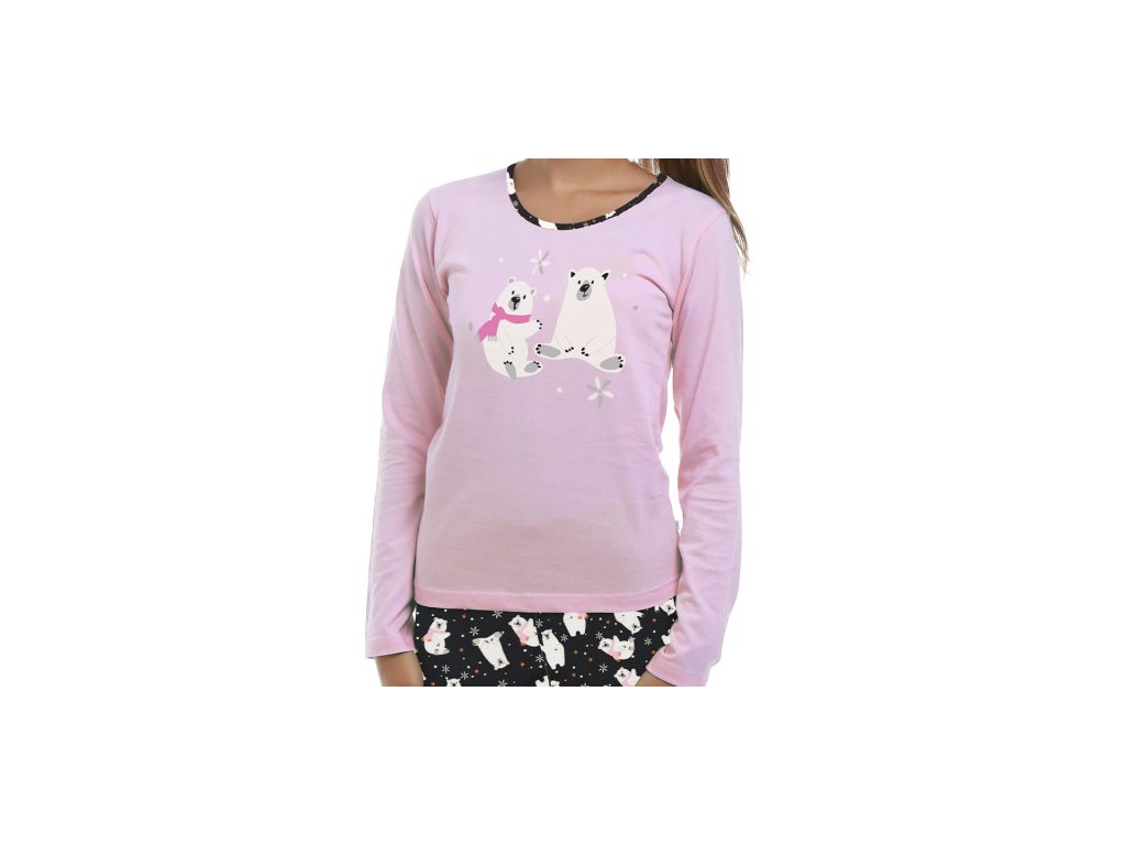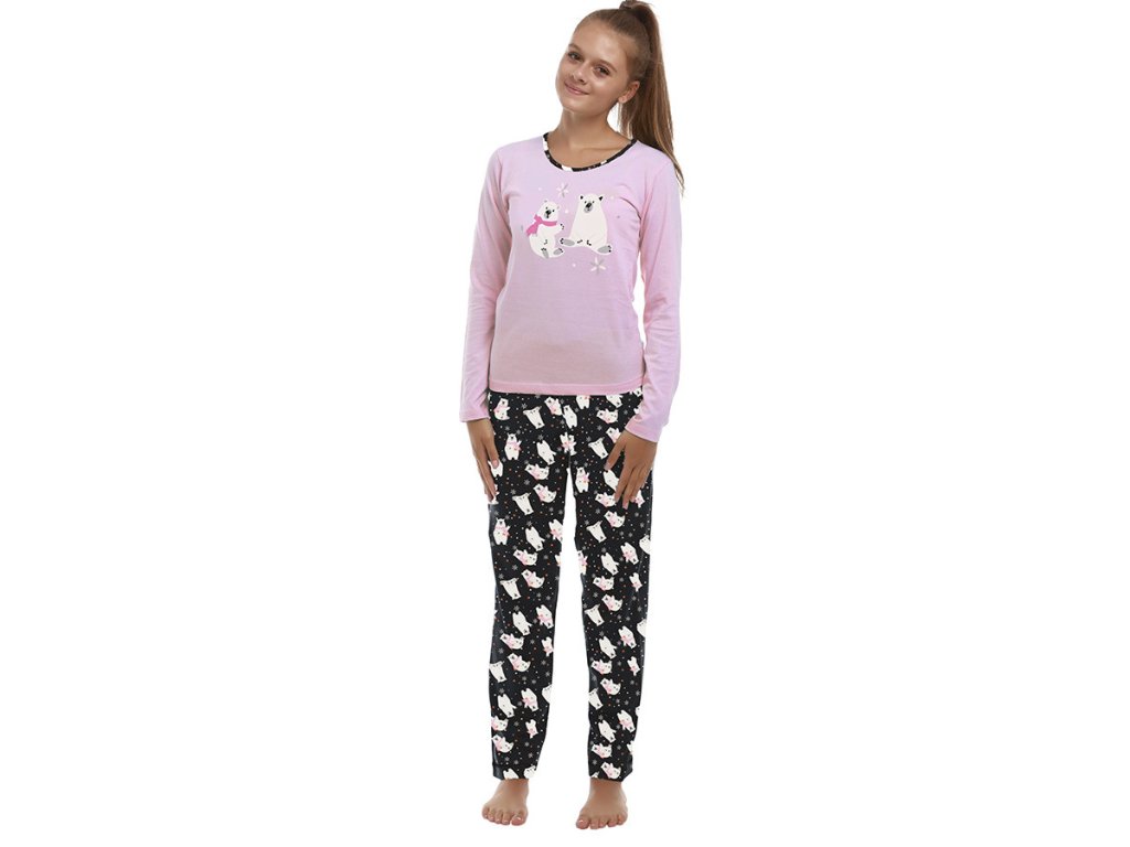 Dívčí pyžamo CALVI vyrobeno ze 100% bavlny, je úžasné příjemné pyžamo s dlouhým rukávem a dlouhými nohavicemi, růžové triko s potiskem ledních medvědů je nepřehlédnutelné, kulatý výstřih u krku je lemován ozdobnou lemovkou v barvě kalhot, kalhoty jsou v klasickém střihu v tmavě modré barvě s celoplošným potiskem ledních medvědů, v pase kalhot je dobře poddajná guma. Super pohodlné pyžamo, které DOPORUČUJEME.