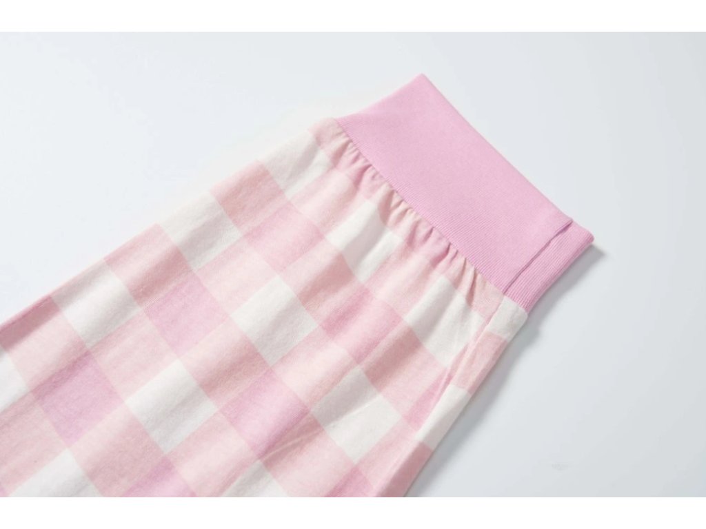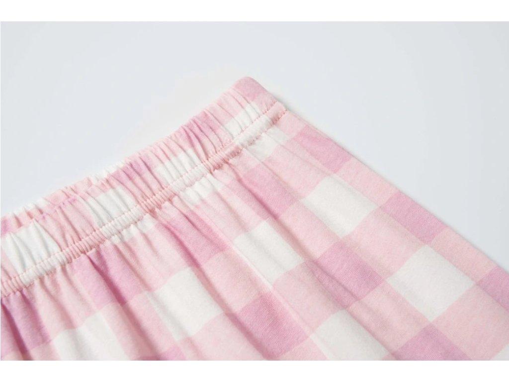 • kalhoty v klasickém střihu a kostkovaném růžovobílém designu