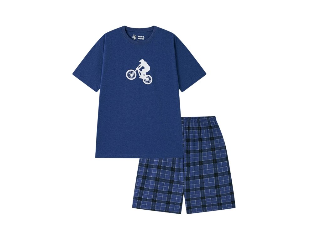 Pánské bavlněné krátké pyžamo, triko v modré barvě, s menším potiskem cyklisty na přední straně, u krku kulatý výstřih s kvalitně vypracovanou lemovkou. Kraťasy pyžama jsou kostkované s pružnou gumou v pase, která Vám zajistí pohodlí a nebude škrtit. Toto příjemné bavlněné pyžamo můžeme jen doporučit.