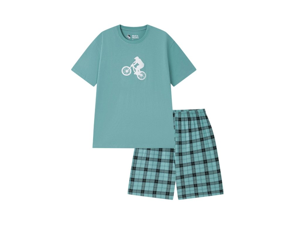 Pánské bavlněné krátké pyžamo, triko v modré barvě, s menším potiskem cyklisty na přední straně, u krku kulatý výstřih s kvalitně vypracovanou lemovkou. Kraťasy pyžama jsou kostkované s pružnou gumou v pase, která Vám zajistí pohodlí a nebude škrtit. Toto příjemné bavlněné pyžamo můžeme jen doporučit.