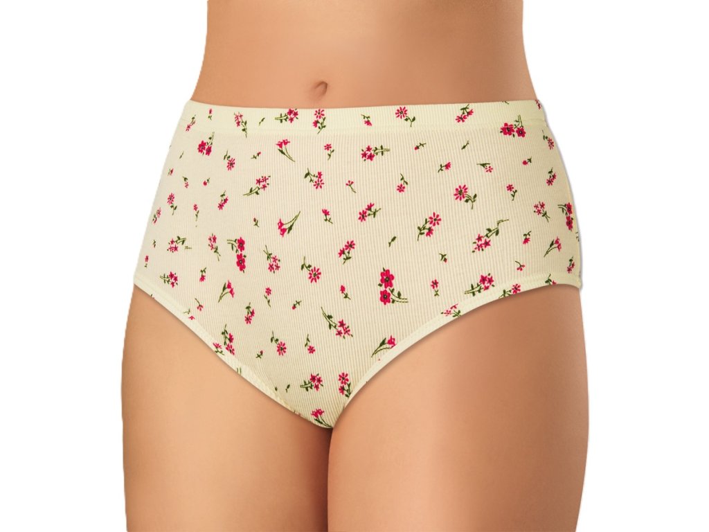 Vysoké bavlněné kalhotky do pasu, vyrobené z bavlněného ribu , který dodává kalhotkám pružnost a komfortní pocit. V pase a kolem nohaviček je zašitá pruženka. Díky pružnému materiálu a střihu jsou tyto kalhotky velmi příjemné a hlavně oblíbené. Dostupné i v nadměrných velikostech. Kalhotky jsou v tělové barvě s potiskem drobných kytiček. Vzor kytiček se může lišit se vzorem na fotografii. Další barevné varianty najdete zde .